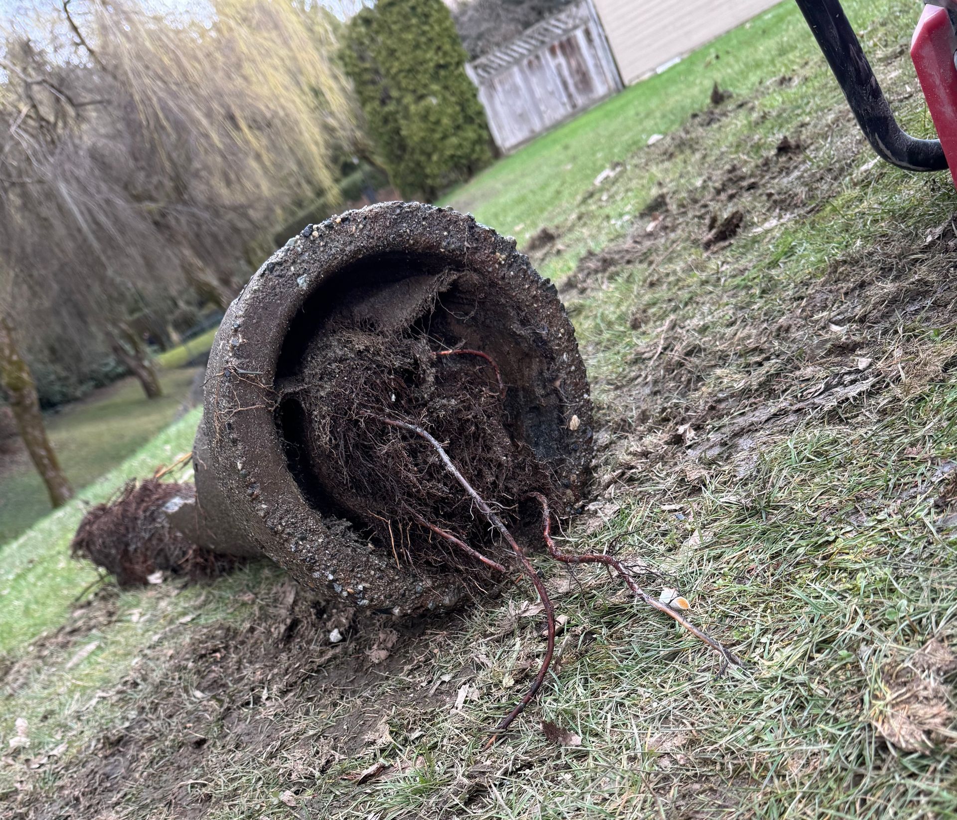 This pipe has been broken down and is now full of tree roots, it can happen over several years or it can also re-occur annually depending on your location.
